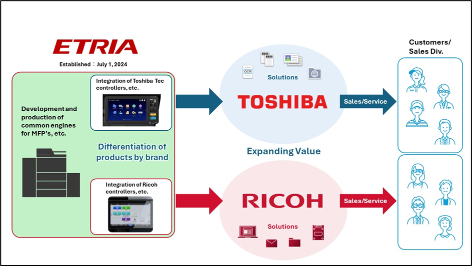 Through a strategic partnership, Toshiba Tec (Toshiba) and Ricoh will jointly develop and produce multifunction printers (MFPs) that combine the best manufacturing capabilities from both companies. This joint venture, ETRIA Co., Ltd (“ETRIA”), will start operating in July 2024 and will offer innovative and competitive print products to the market.